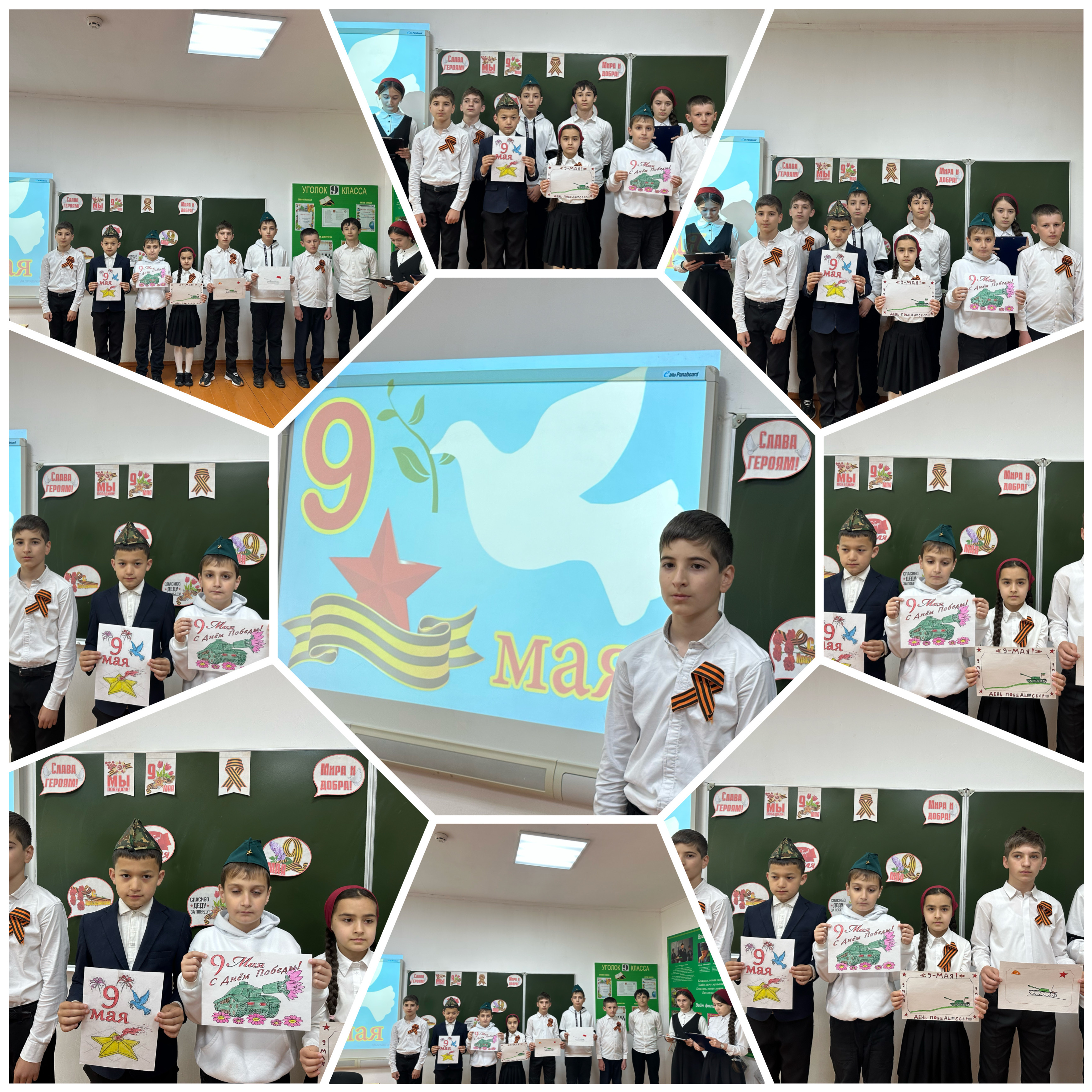 Классный руководители предварительно провели с детьми в классах беседы о подвигах советских людей, в классах были оформлены выставки детских работ Цель: Сформировать представление учащихся о Великой отечественной войне и её героях. Показать, какое большое историческое значение имеет День Победы – 9 Мая в истории развития нашей страны. Содействовать воспитанию интереса к истории своего Отечества. Развитие и воспитание патриотических чувств на ярких примерах героизма нашей армии, храбрости и мужества народа.
